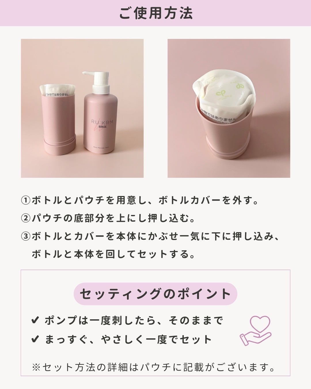 専用パウチをセットして使用する構造のため、クリームが直接触れず繰り返し使えるつくりです。